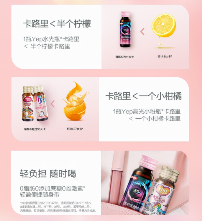 值得一提的是,“0 添加蔗糖 0 脂” 的概念让吃零食没有了发胖的负罪感,成为食品行业发展趋势。作为对行业趋势的准确洞悉和前瞻布局,Yep水光瓶以“轻负担,放心喝”为卖点,站在“用户思维”努力平衡功效与能量摄入,在保持丰富清新果香的同时,做到0脂肪、0雌激素添加,保证一瓶Yep水光瓶的卡路里小于半个柠檬的卡路里,以可量化的方式说服消费者“好喝轻负担”的健康饮品值得拥有。
