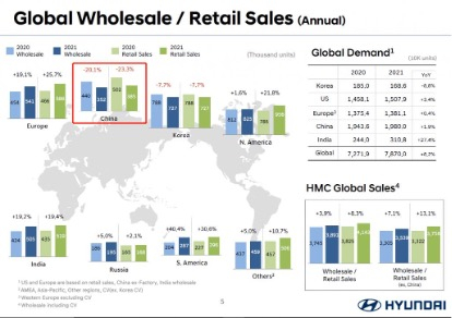 但聚焦到中国市场,现代汽车2021年全年销量38.5万辆,同比下跌23.3%,而去年初现代汽车定下的销量目标是56万辆,实际销量与目标销量相差甚远。另外,2021年全球市场中,现代汽车仅在中国和韩国本土两大市场遭遇了年度下滑。