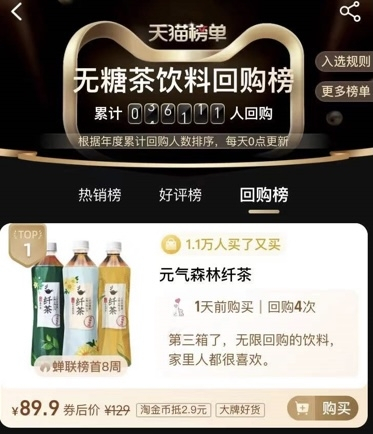 又一爆款?元气森林新品纤茶连续三周蝉联天猫榜单榜首