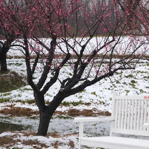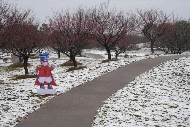 在近300亩的梅园当中,60多种梅花正逐渐开放。昨晚的一场雪,让白色覆盖了整个园区,让梅园更具韵味。