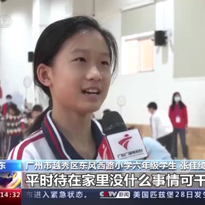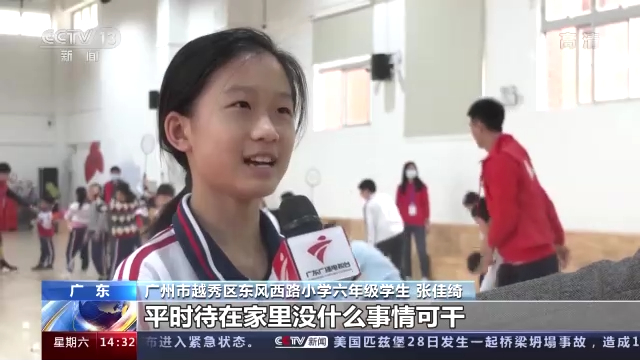 广州市越秀区东风西路小学六年级学生 张佳绮:我报了羽毛球、篮球,还有花式跳绳,我自己个人比较喜欢体育,平时待在家里没什么事情可干,来学校刚好可以锻炼一下自己,在学校有同学陪伴就很开心。