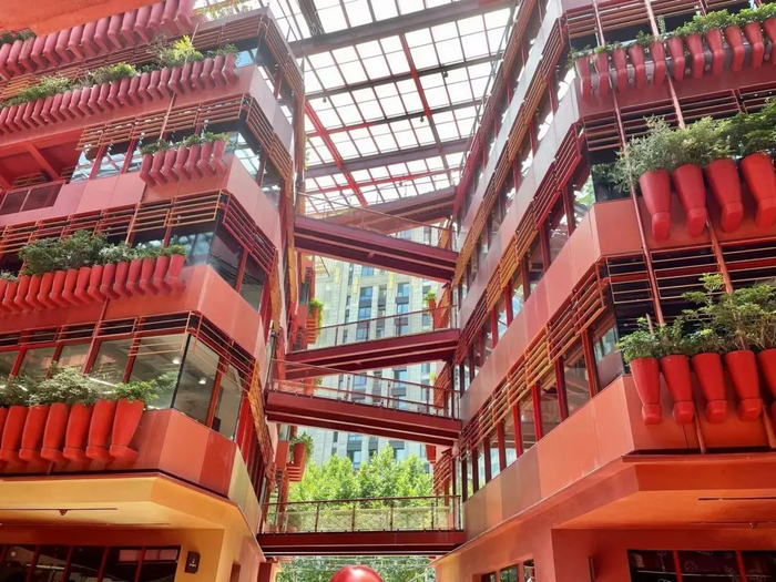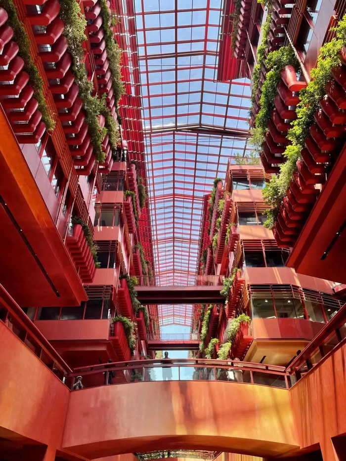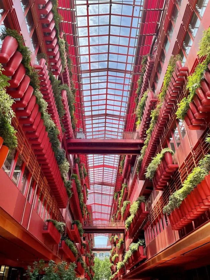 建筑内侧醒目的丹霞红色搭配约2500个花钵组成的绿色将整个建筑和自然融合得恰到好处。