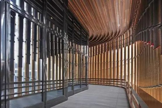 保利大剧院的外形十分简洁,为方形和圆形的组合。大面积幕墙中镶嵌了暖色的木质圆筒和部分水泥条块。