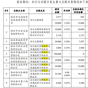 年报显示,2019年,桂林银行与桂林兄弟木业有限责任公司、桂林百越达投资有限公司、桂林金色雨林木业有限责任公司、桂林大龙投资有限公司、桂林桂冶机械股份有限公司、桂林桂冶重工股份有限公司6家公司发生重大关联交易。