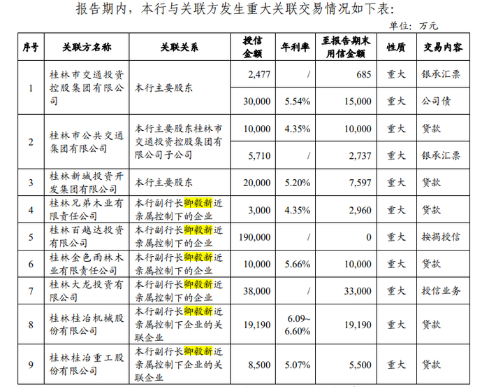 据悉,桂林银行2019年与9家关联方发生重大关联交易,其中6家与该行原副行长卿毅新有关。2020年4月,卿毅新辞任该行副行长。