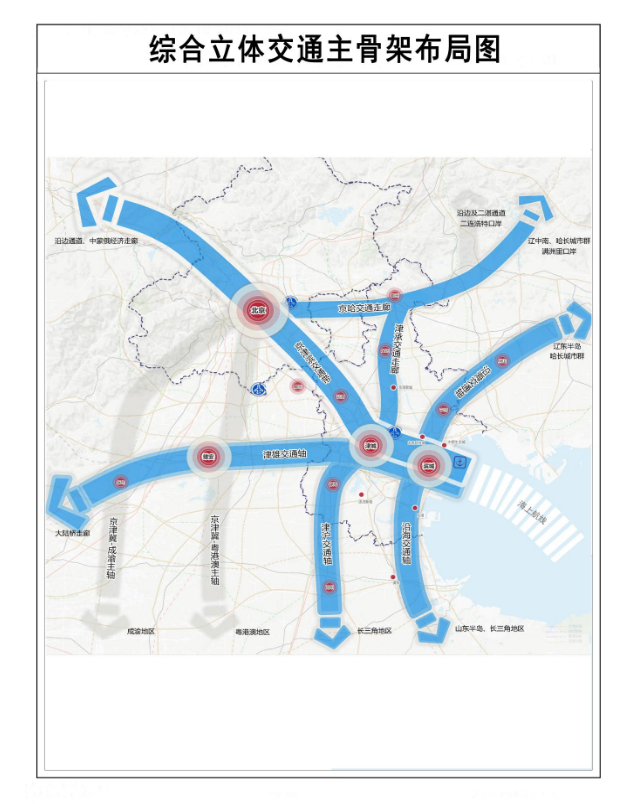 为落实国家规划纲要,支撑构建京津冀世界级城市群,服务本市“一市双城多节点”城镇发展格局、“三区两带中屏障”生态格局,打造多通道、大容量、快速化“1带3轴2廊”综合立体交通主骨架,由高铁城际、普铁干线、市域(郊)铁路、高速公路、普通国省道的关键线路组成。