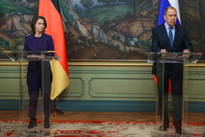 1月18日,德外长贝尔伯克与俄外长拉夫罗夫在莫斯科举行联合新闻发布会 图自澎湃影像