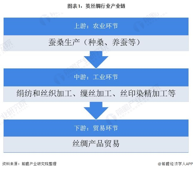 茧丝绸行业产业链上、中、下游主要包括上游农业环节、中游工业环节和下游贸易环节。