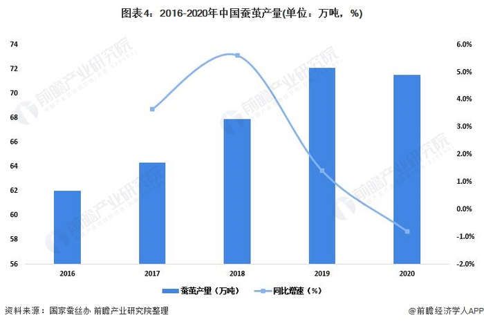 虽然桑园面积小幅增加,但2020年我国蚕茧产量五年来首次出现下降。根据全国20个主产省(区、市)报送数据,2020年全国蚕茧产量71.5万吨,较2019年减少了0.58万吨,同比下降0.8%。