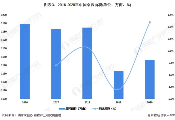 根据全国20个主产省(区、市)报送数据,2020年全国桑园面积1146.5万亩,较2019年增加13.6万亩,同比上升1.2%。
