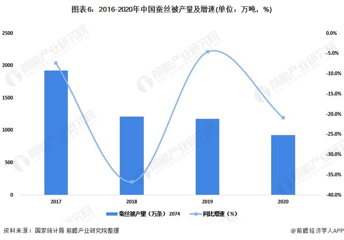 蚕丝被是以蚕丝丝绵为主要填充物的被子,是定位中高端的家纺产品,由于其保暖透气、轻盈贴身、亲肤抗敏等诸多特点已成为茧丝绸行业发展的一个支柱产品。2020年我国蚕丝被产量924万条,同比下降20.9%。