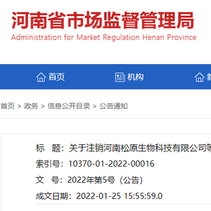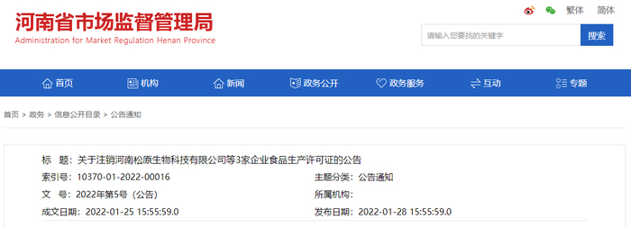 中国质量新闻网讯 2022年1月28日,河南省市场监督管理局网站发布关于注销河南松原生物科技有限公司等3家企业食品生产许可证的公告。