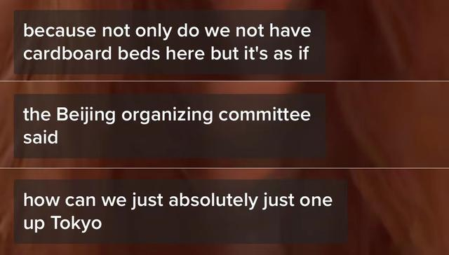 冬奥村的床让萨默意外又惊艳,“我有一些令人难以置信的东西要分享,我们这里不仅没有纸板床,而且北京奥组委好像在说,‘我们怎么可能只比东京奥运会强一点呢?’”