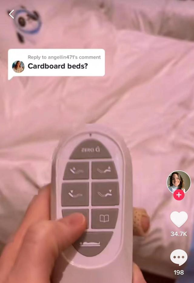 视频中,她拿起了有8个按钮的床用遥控器,向观众展示床垫可以升高、降低到各种位置,“电视模式”能让床头调整到接近沙发的状态,看起来极度舒适,她还拍摄了自己躺在睡袋里的场景,介绍自己处在零重力模式,这让她非常震撼。