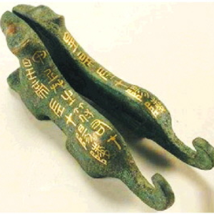 虎符,古代帝王授予臣属兵权和调发军队的信物。用铜铸成虎形,背有铭文,沿虎脊一分为二,右半留在中央,左半发给地方官吏或统兵的将帅。调发军队时,须由使臣持符验合,方能生效。虎符盛行于战国、秦、汉。唐高祖避其祖李虎的名讳,废除虎符,改用鱼符,武则天改为龟符,中宗初年又恢复为鱼符。南宋时恢复使用虎符,元朝则用虎头牌。