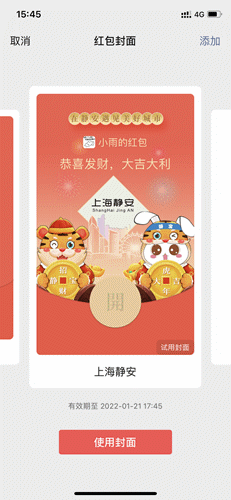 ③ 左右滑动,选择你已领取的“上海静安”红包封面,并点击“使用封面”