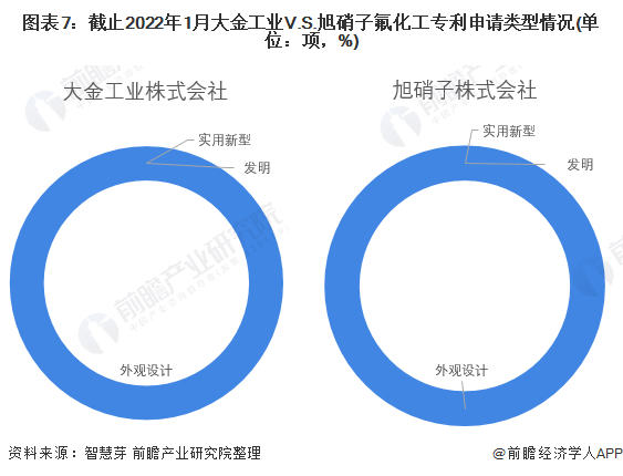 旭硝子和大金工业氟化工专利申请类型以外观设计为主。截至2022年1月,大金工业和旭硝子氟化工专利申请类型均为外观设计。