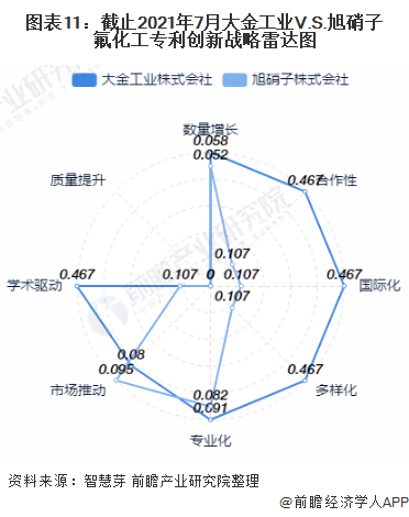 整体来看,大金工业氟化工技术在数量增长、学术驱动、合作性、多样化和国际化具有相对竞争优势,旭硝子氟化工技术则在市场推广上具有相对竞争优势。