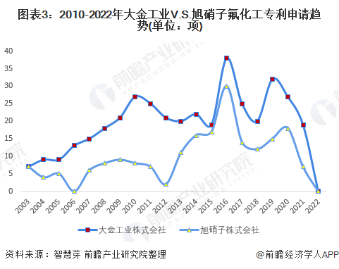 从趋势上看,2010-2022年1月,大金工业在氟化工领域专利申请量每年均比旭硝子多,2019年两者氟化工专利申请量相差更是高达2倍左右,分别为32项和15项。