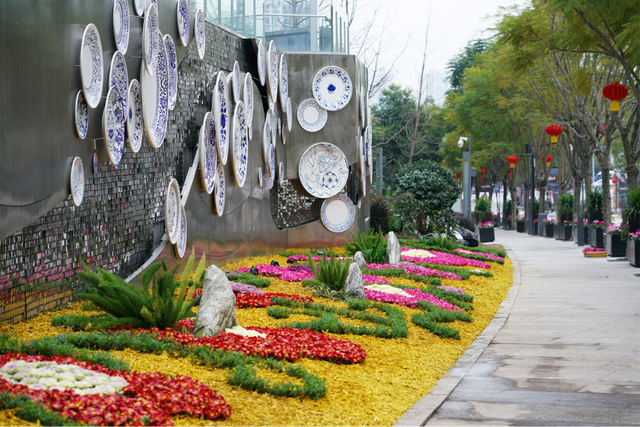 丝路花街上,“承”接新丝绸之路连接中华与世界的不变初心、最具中国文化特色的青花瓷盘组合成的花朵造型墙,这次更加出彩。地上用黄色的木屑铺底,配上精致的红花、绿叶,远看俨然是一幅长长的刺绣画卷绵延铺开,历史的长河、永恒的星空、蔚蓝的大海在这里交汇……