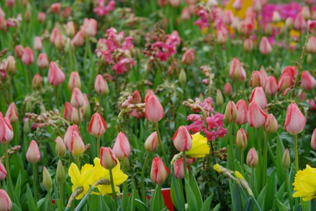 地中海花卉主题展示区主要用郁金香和洋水仙来呈现,与四只彩色的骆驼相映成趣。旁边的地中海花园内还设有座椅等,往那一坐,神清气爽。
