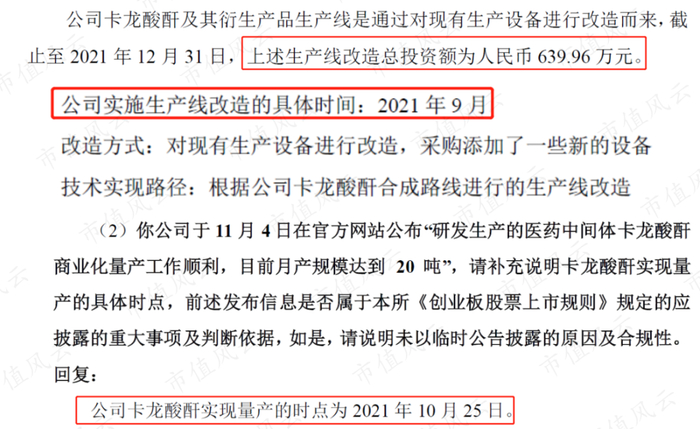 事实上,雅本化学拥有的卡龙酸酐生产专利技术,是在2016年花50万元购买取得的;而这个实现量产的生产线,也只不过是雅本化学在2021年9月,花了640万元对现有生产设备改造而来,并且实现量产的时点为2021年10月25日。