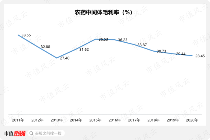 雅本化学农药中间体产品的毛利率在2015年迎来向下的拐点后,便一路下降,与富美实这个大体量客户开始合作后,毛利率也依然保持稳定的下降趋势。