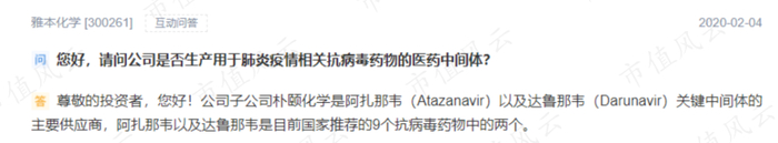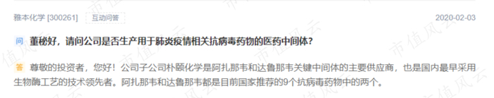 2020年2月3日、4日,新冠肺炎疫情刚刚爆发之际,有投资者在互动易平台上询问雅本化学,是否有生产用于肺炎疫情相关抗病毒药物的医药中间体?