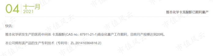 2021年11月4日,雅本化学在其官网发布了一则快讯,称公司研发生产的医药中间体卡龙酸酐商业化量产工作顺利,目前月产规模为20吨,且拥有该产品的生产专利技术。