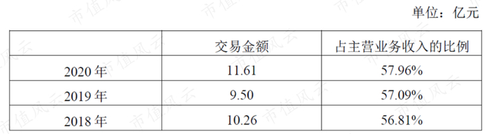 再来看一组数据,根据雅本化学的披露,2018年至2020年,雅本化学与富美实发生的交易金额分别为10.26亿元、9.50亿元、11.61亿元,占当年主营业务收入的比例都将近60%,又分别占当年农药中间体产品销售收入的84.79%、92.59%、77.97%。