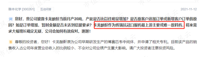 但随后的几个交易日,雅本化学的股价依旧平平,直到11月12日,一票投资者(经统计,共11名)“突然”在互动易急切的询问雅本化学有关卡龙酸酐和辉瑞公司新冠口服药物的情况,甚至有投资者直言“卡龙酸酐为辉瑞抗新冠口服药最上游主要或唯一原料药”。
