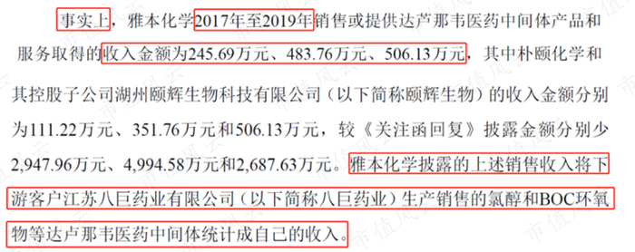 雅本化学2017至2019年销售或提供达芦那韦医药中间体产品和服务,实际取得的收入仅为246、484和506万元,根本就不是雅本化学在回复关注函中提到的3,059、5,296、3,194万元。