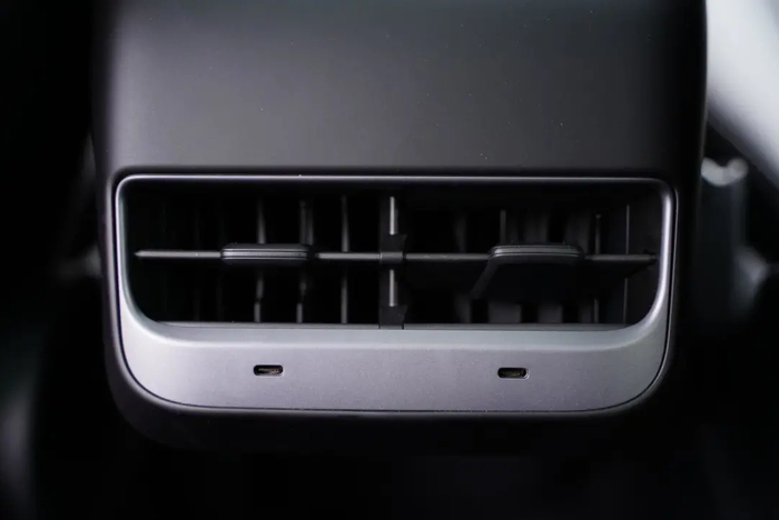 特斯拉 Model Y车内后排两个USB-C口特写。
