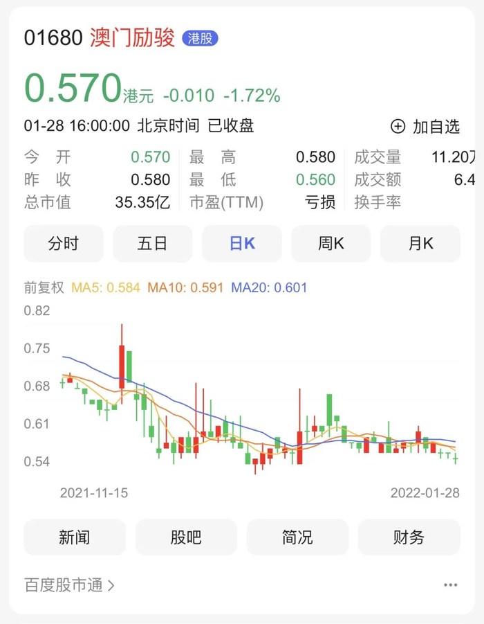 二级市场方面,截至最新收盘日,澳门励骏股价报0.57港元/股,总市值为35.35亿港元。