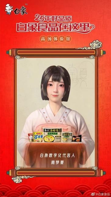 近期,白象食品官宣元宇宙国风少女南梦夏成为其数字化代言人。这也是国内首位数字化代言方便食品的小姐姐。同时,“白象高汤体验馆——白象食品全国百城巡游”也于首站济南启动,“6小时慢熬工艺理念”带来的真材实料真高汤品质体验引发了消费者的深度认可,生动传递了白象食品“25年好品质”的价值追求。活动现场,南梦夏作为国货方便面品牌率先签约的数字化体验官,成为了整场活动的焦点。白象食品的用户们在南梦夏的带领下,一同体验元宇宙虚拟世界的神奇科技,探索白象高汤的奥秘,感受中国传统文化的无穷魅力。