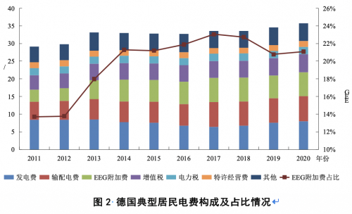 在政策推动下,德国可再生能源发展迅速,到也导致用户用户电费负担逐步增加。2011-2020年,德国居民电价上涨超过20%。其中,发电部分稳中有降;输配电费上涨约40%,占比稳定在20%左右;EEG附加费几乎翻倍,其占比由2011年的14%升至2020年的21%,成为居民电价增长的主要因素。