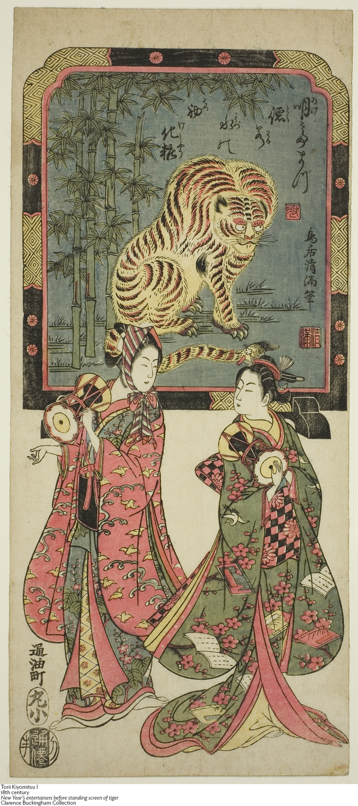 鸟居清满,《虎图屏风前为新年助兴的艺人》,18世纪,芝加哥艺术博物馆,馆藏编号:1925.1999