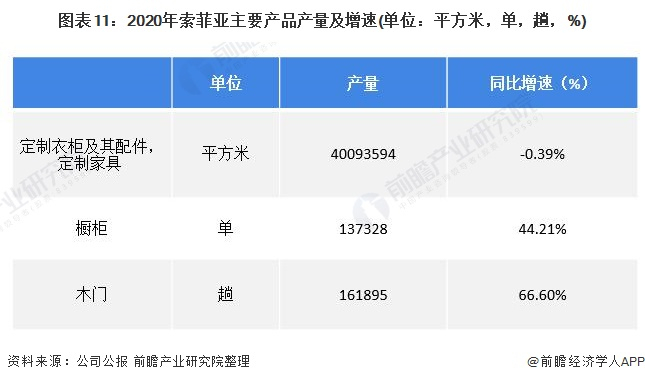 2020年,索菲亚橱柜业务和木门业务订单量增加,生产能力增加导致生产量增加。2020年索菲亚定制衣柜等产品产量小幅下降0.39%;橱柜和木门产量大幅增长,分别较2019年同比增长44.21%和66.60%。