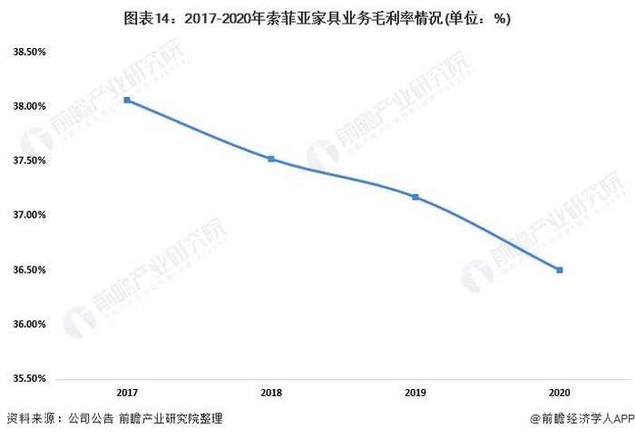 在毛利率方面,2017-2020年索菲亚家具业务的毛利率逐年下降,但总体保持较高水平。2020年公司家具业务毛利率为36.50%。