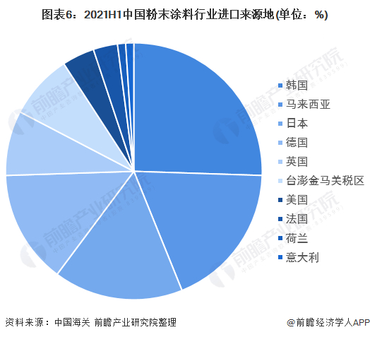 从粉末涂料进口来源地来看,我国粉末涂料的进口来源地集中度较高,2021年上半年,韩国是中国最大的粉末涂料进口国,占比为26%。此外,马来西亚、日本、德国进口占比均在10%以上。