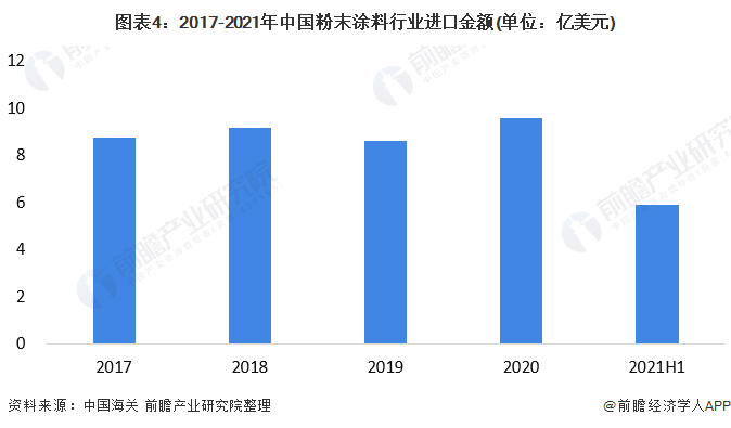 从粉末涂料的进口规模来看,2017-2020年,我国粉末涂料行业的进口金额较为波动,2020年,我国粉末涂料进口金额为9.59亿美元。2021年上半年,我国粉末涂料的进口金额为5.91亿美元。