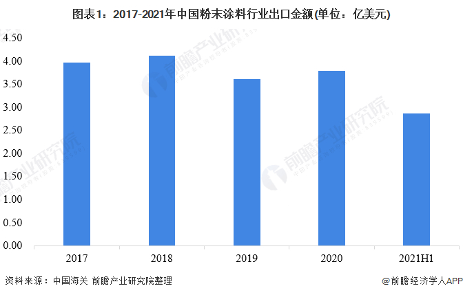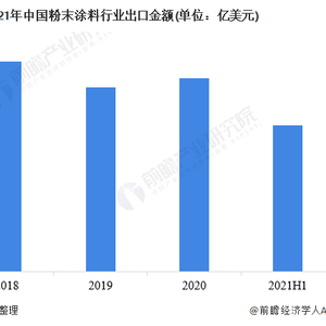 从粉末涂料的出口规模来看,2017-2020年,我国粉末涂料行业的出口金额较为波动,2020年,我国粉末涂料出口金额为3.79亿美元。2021年上半年,我国粉末涂料的出口金额为2.87亿美元。