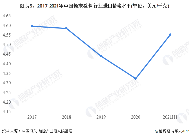 2021年上半年,粉末涂料的进口平均价格上升为4.55美元/千克。
