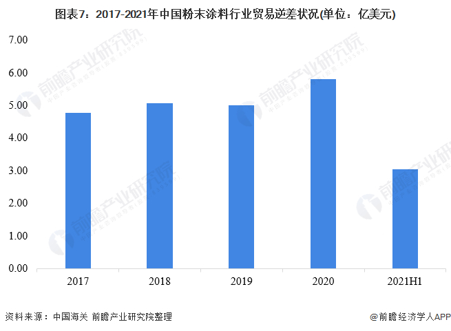 2017-2020年,中国粉末涂料行业贸易逆差呈波动上升趋势。2020年,中国粉末涂料行业贸易逆产达到了5.80亿美元。2021年上半年,中国粉末涂料行业贸易逆产为3.04亿美元,贸易逆差态势短期无法改变。