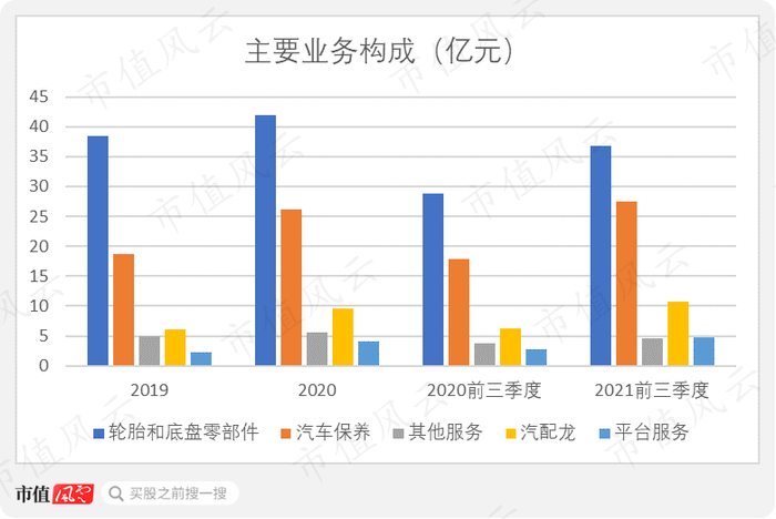公司销售产品和服务的规模较大,但毛利低;平台服务规模小,毛利高;汽配龙是公司增长最快的业务之一。