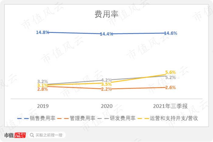 公司的管理费用率仅为2.6%,已经处于较低水平;销售费用率相对稳定;研发费用率以及运营和支持开支占比则有所上升。