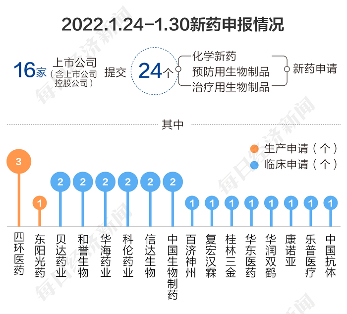 根据药渡数据,2022年1月最后一周(2022年1月24日至2022年1月30日),国家药品监督管理局药品审评中心(CDE)共收到16家上市公司(含上市公司控股公司)提交的24个化学新药、预防用生物制品、治疗用生物制品新药申请。