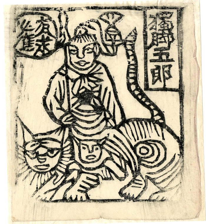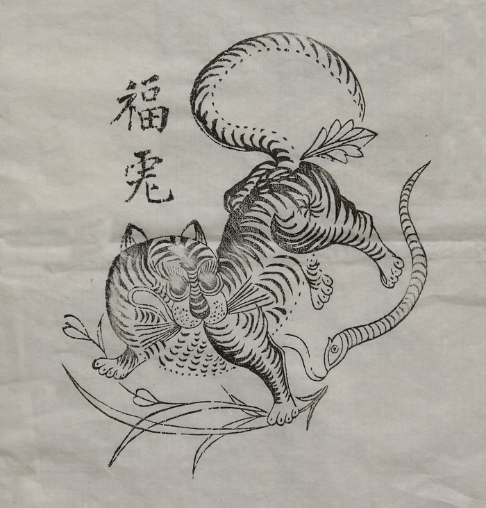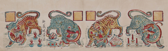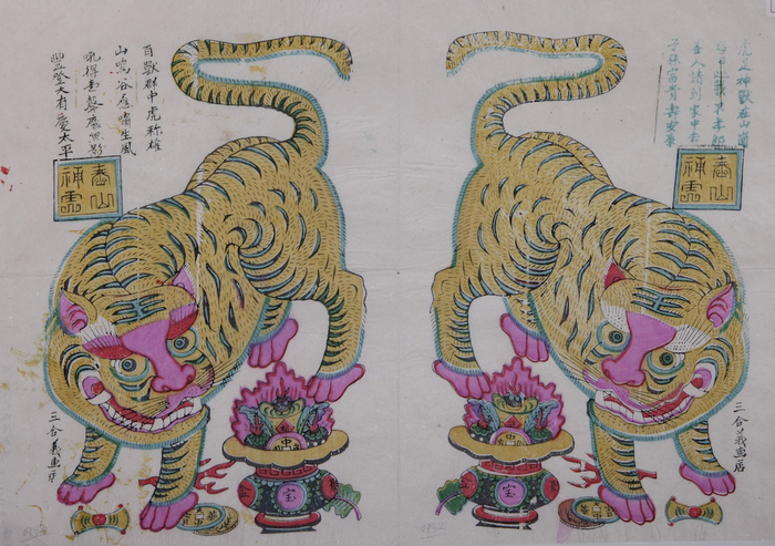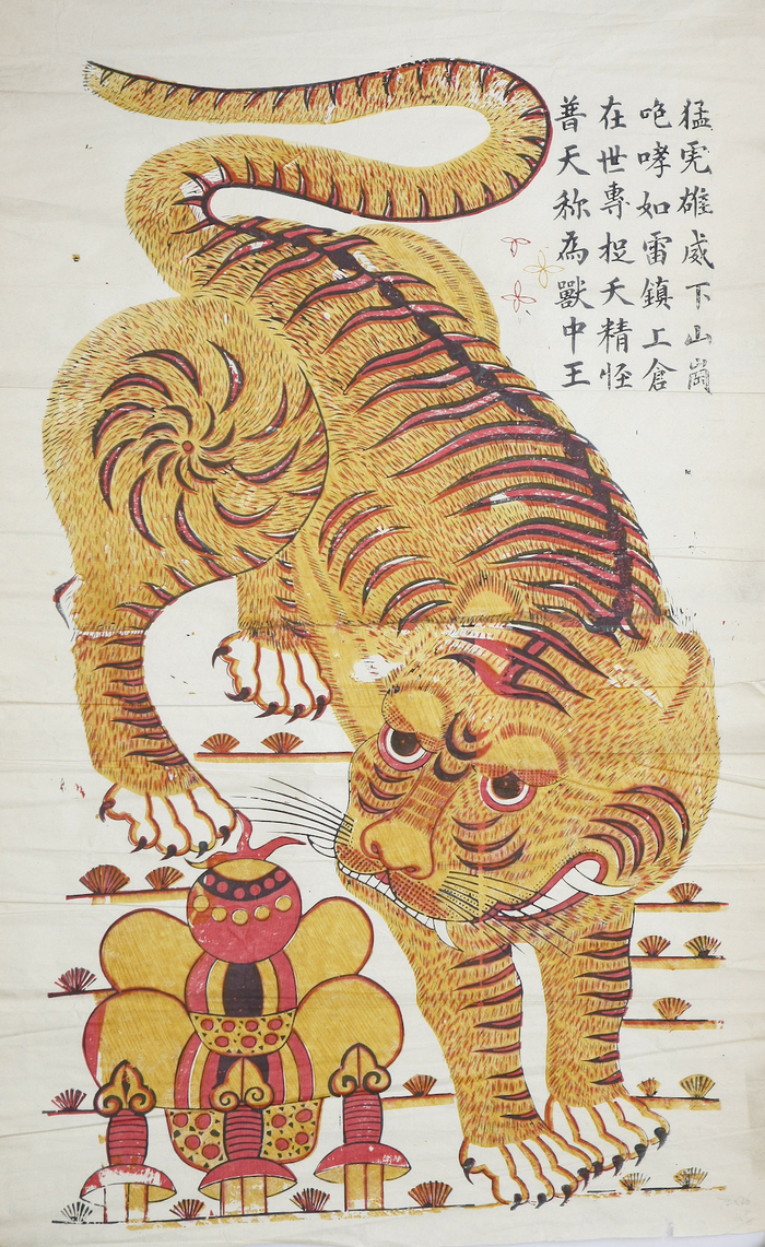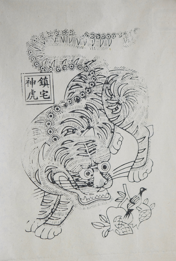 中华民族源远流长的文化长河中,关于虎的传说与图像也不胜枚举。我国古代普遍崇信的四个方位神中即采用白虎形象来指代西方,汉代画像石中也有大量的虎纹饰出现。除此之外,不论是文人墨客还是民间画师,均塑造了不少关于老虎的艺术形象,足以显示老虎在人们心中的地位。千百年来,华夏民族常常处于天灾、人祸、兵荒战乱之中,人们需要休养生息,祈祷和平和安宁,便赋予“百兽之王”——老虎以纳福驱灾的属性,崇虎的行为也逐渐转化为普遍的民间习俗,年画中自然也少不了和虎相关的内容。
