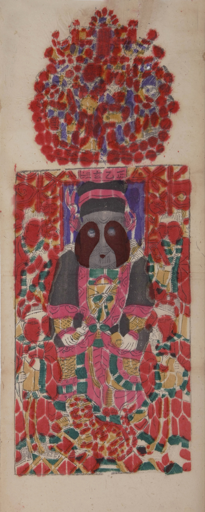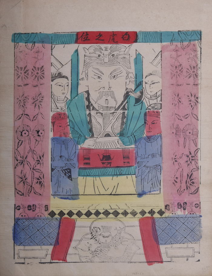 此外,白虎作为古代神话中的四灵之一,也是主西方的方位神,并和青龙被道教作护卫神用于道观山门处。宋代范致明《岳阳风土记》云:“老子祠有二神像,所谓青龙白虎也。”明姚宗仪《常熟私志》叙寺观篇云:“致道观山门二大神,左为青龙孟章神君,右为白虎监兵神君。”故民间常有“左青龙、右白虎”之说法,纸马中亦有《右白虎》之作品。河北的二件《右白虎》纸马中的白虎君皆为文官打扮,头戴纶巾,立于祥云之中。其中一位年纪稍长者身穿紫红相间衣袍,饰海水江崖图案和云纹,手握龙头长斧,身后跟随一侧身猛虎,但面部却呈正面,气势雄赳;另一位白虎君白面,身着红绿衣衫,饰花卉图案,身后亦跟随一猛虎,昂首翘尾,生动传神,此幅作品神龛的最上方有二龙双剑图案,中间花瓶中插有三支画戟,亦为“平升三级”之意。二幅纸马皆刻制精细、套印准确,为河北、北京等地常用的纸马形式。