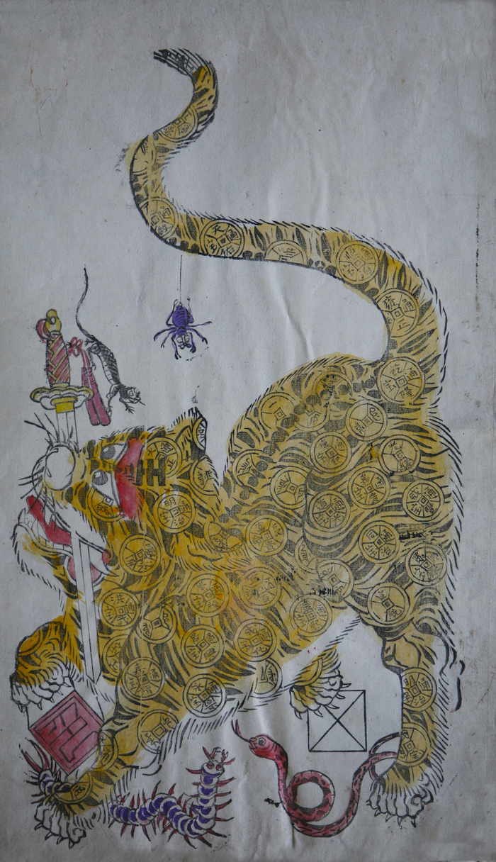 年画中的老虎形象最早出现在门画中。《周礼·春官》记载门画虎时提到:“师氏居虎门之左,司王朝。”并注释云:“虎门,路寝门也,王日视朝于路寝,门外画虎焉,以明猛于守,宜也。”师氏指的是周朝的官名,掌三德三行,教国子,位居于虎门之左。虎门即路寝门,乃周王每日处理朝政的地方,位置显要,故需要在这里的门上画虎的形象,以备守卫。到了汉代,门上画虎的范围扩大,应劭《风俗通义》卷八记载:“县官常以腊除夕,饰桃人,垂苇茭,画虎于门,皆效于前事,冀以卫凶也。”汉代除了县官“画虎于门”外,地下墓室里的门上刻画着虎形或白虎铺首的画像石也不断出土,可以证实其说。应劭《风俗通义》卷八中还记载了汉代除夕画虎于门的原因,即“虎者,阳物,百兽之长也。能执搏挫锐,食鬼魅。令人卒得恶遇,烧焐虎皮饮之,击其爪亦能辟恶,此其验也”。至今,河北武强、陕西凤翔等地的年画还有多种虎门神题材,在云南丽江纳西族也有贴《雷霆白虎之神》等图藉以御凶的风俗。此外,东汉王充《论衡》引《山海经》云:“立大桃人,门户画神荼、郁垒与虎,悬苇索以御凶魅”。蔡邕《独断》中也记载了“神荼、郁垒”与虎之间的关系:“岁竟十二月,从百隶及童儿而时傩,以索宫中驱疫鬼也;桃弧、棘矢、土鼓,鼓且射之,以赤丸五谷播洒之,以除疾殃。已而立桃人、苇索、儋牙虎、神荼、郁垒以执之。神荼、郁垒二神:海中有度朔之山,上有桃木,蟠屈三千里,卑技东北有鬼门,万鬼所出入也,神荼、郁垒二神居其门,主阅领诸鬼,其恶害之鬼,执以苇索,食(喂)虎。故十二月岁竟,常以先腊之夜逐除之也。乃画荼、垒并悬苇索于门户,以御凶也。”此描写也常被用作门神起源而引用。唐代时,民间流行画虎头于门上以防止瘟疫疾病的民俗活动,段成式《酉阳杂俎》载:“俗好于门上画虎头,书聻字,谓阴刀鬼名,可息疫疠。”该习俗至今还在福建、广东沿海一带有迹可循。